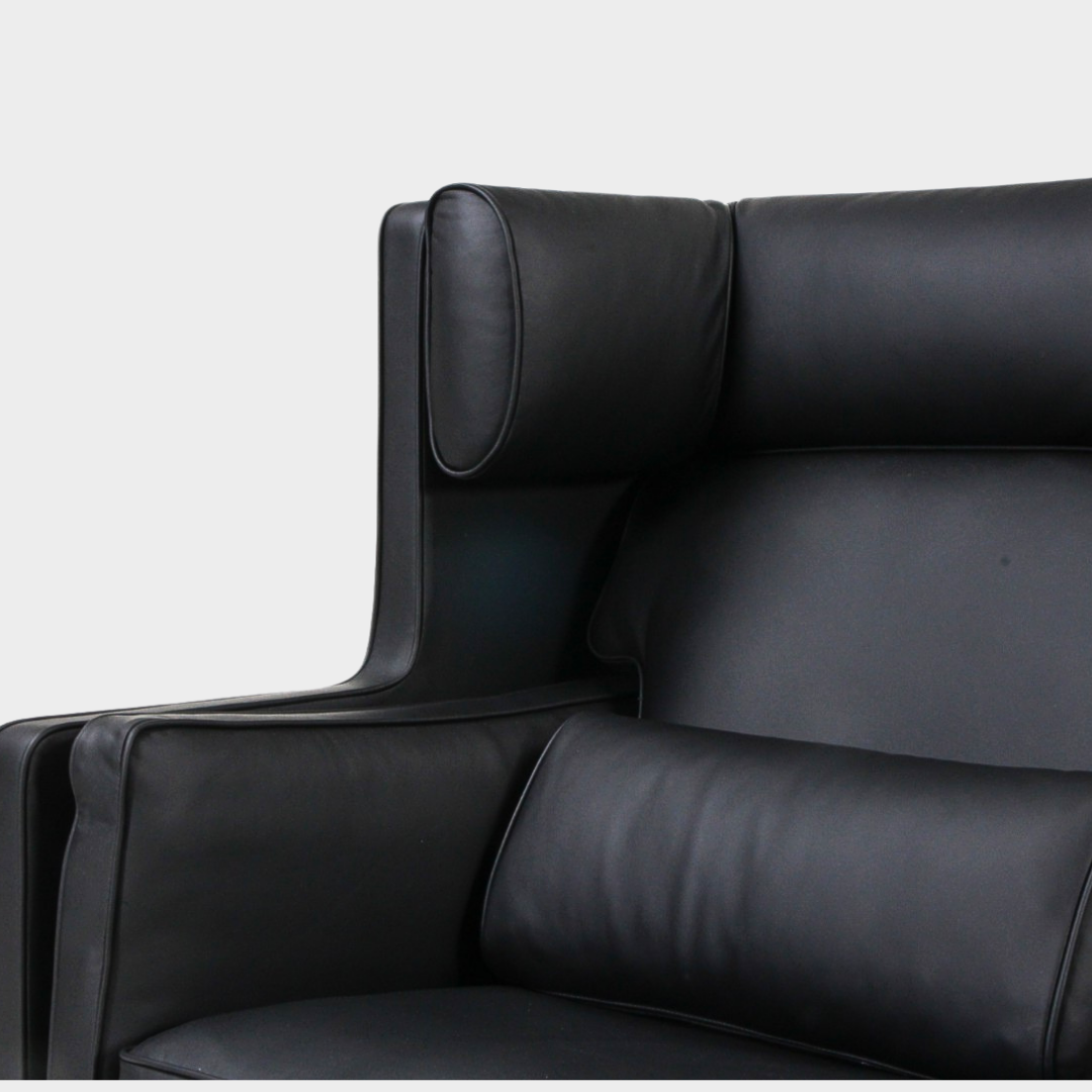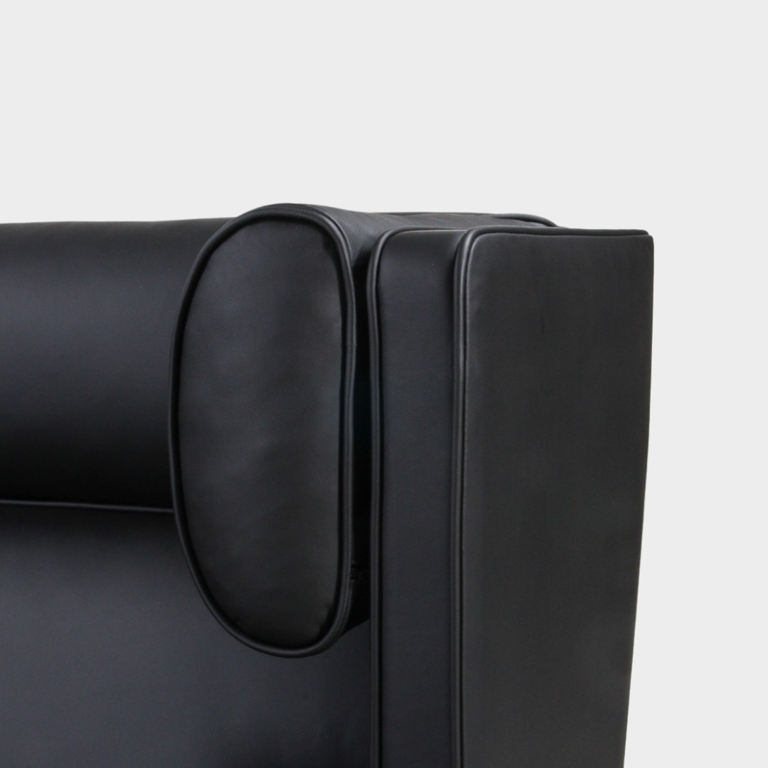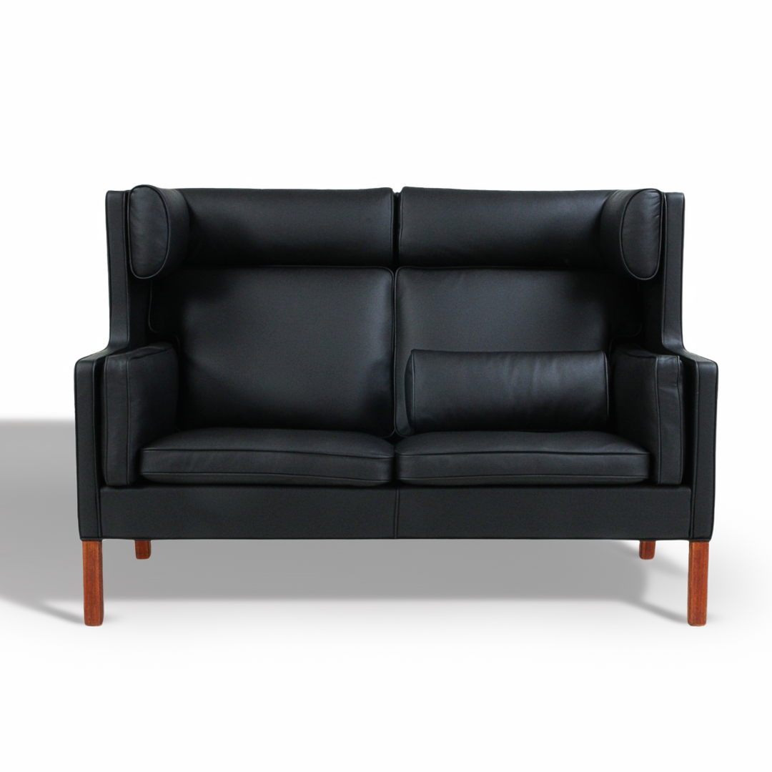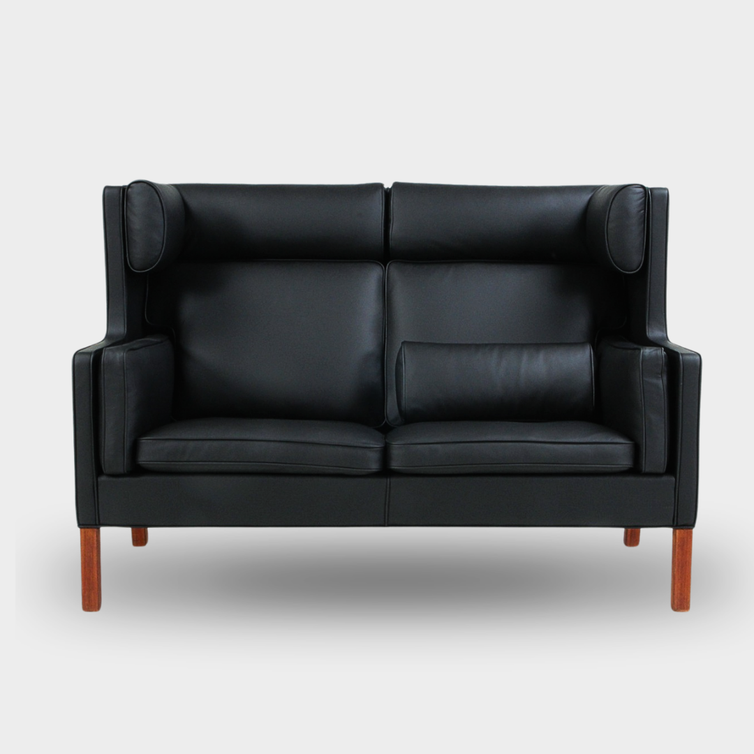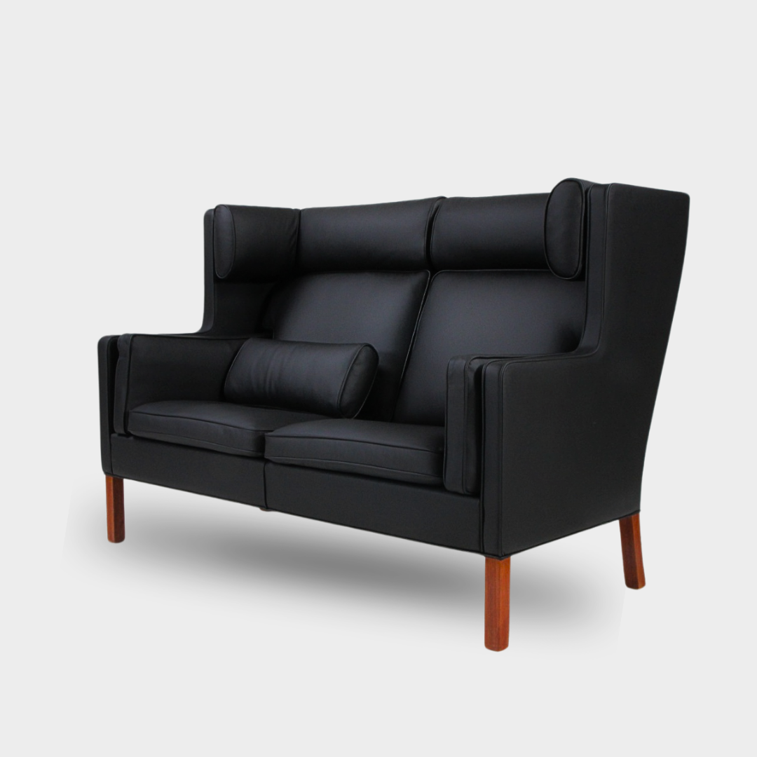 Børge Mogensen to personers kupé sofa. Nypolstret med sort læderbetræk. Ben i Valnød.